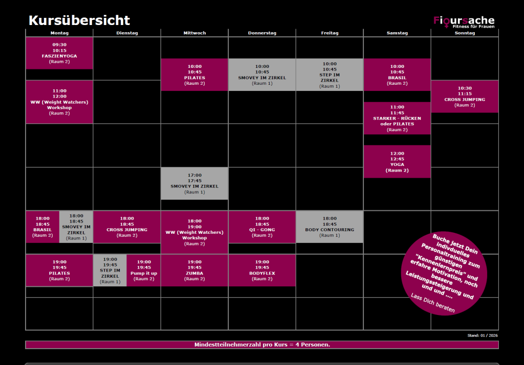 Unsere Kursangebote sind so gestaltet, dass sie sich flexibel in Ihren Alltag integrieren lassen. Egal ob Anfängerin oder Fortgeschrittene – bei uns finden Sie das passende Trainingsformat. Sie möchten Figursache kennenlernen? Nutzen Sie die Möglichkeit eines Probekurses und überzeugen Sie sich selbst von unserer Atmosphäre und unserem Konzept.